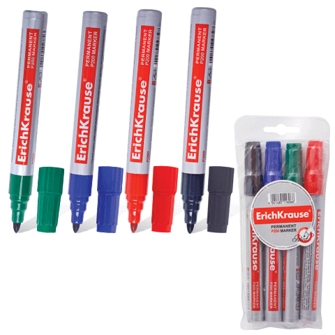 Набор маркеров из 4 штук: синий, зеленый, красный, черный. Предназначены для письма на любой поверхности. Заправлены водостойкими несмываемыми чернилами.