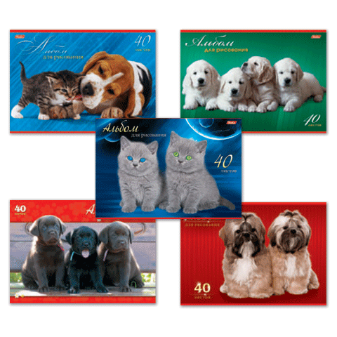 Красочная серия альбомов для рисования с ярким разнообразием в дизайне обложки. Изображение домашних питомцев обязательно привлечет юных художников.