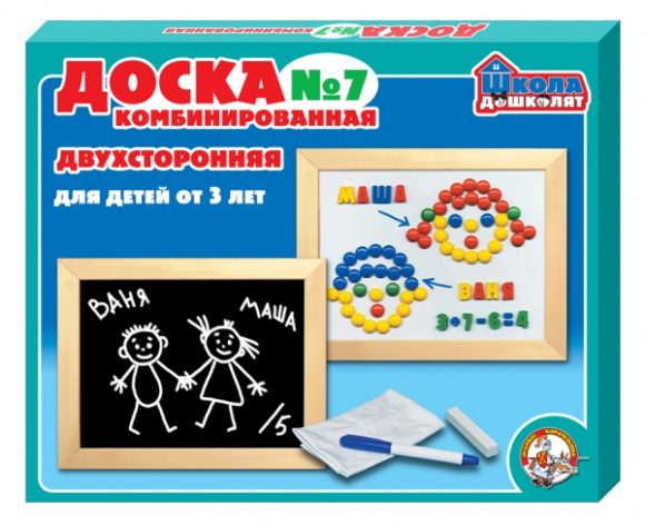 Доска №7 небольшого размера и не занимает много места, что позволяет разместить ее в любом удобном для ребенка месте. Предназначена для занятий с детьми дошкольного возраста. Обе стороны доски можно задействовать как для игры, так и для обучения.