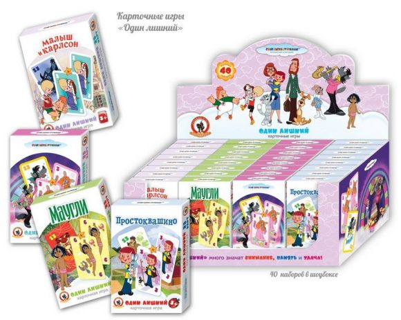 В дисплее карточные наборы по мотивам мультфильмов: "Маугли", "Трое из Простоквашино", "Ну, погоди!", "Малыш и Карлсон".