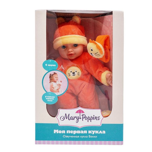 Куколка озвученная с мягконабивным телом, с твердыми ручками и ножками. Такую куколку очень приятно обнимать и держать на ручках. Высота куклы: 30 см. Если нажать кукле на животик, она будет по-детски лепетать. Озвучка у куклы реалистичная: она говорит "мама", "папа", плачет, смеется, лепечет. Кукла одета в велюровый костюмчик и шапочку с забавными ушками. Поставляется в комплекте с игрушкой-браслетом с головой львенка. Браслет надевается на ручку куклы. Работает от 3 батареек AG13 (LR44) 1,5V, входят в комплект, перед использованием необходимо удалить блокировку из чипа. Рекомендованный возраст: 3 года +.
