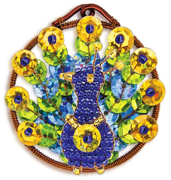 Серия изящных ювелирных кулонов в виде милых миниатюр: в круг из медной проволоки вплетается маленькая сюжетная сценка! Переливающийся бисер и искрящиеся пайетки играют разными цветами и создают эффект движения: вызывающе красивый павлин распустил свой дивный хвост. Изделие сплести не сложно, нужно только немного терпения и усидчивости. Получится изумительное украшение, которое можно носить или подарить.