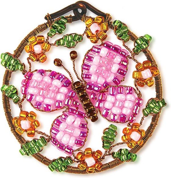 Серия изящных ювелирных кулонов в виде милых миниатюр: в круг из медной проволоки вплетается настоящая маленькая сюжетная сценка! Переливающийся бисер играет разными цветами и создаёт ощущение движения: бабочка на маленьких золотых цветах раскрыла крылья. Изделие потребует терпения и усидчивости, зато в итоге получится украшение, которое будет приятно носить или подарить.