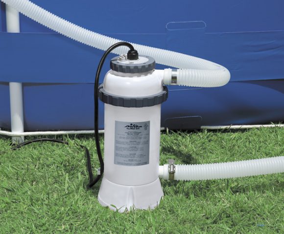 Электронагреватель воды для каркасных и надувных бассейнов Intex диаметром не более 457 см (емкостью до 17000 литров). Подключается к фильтрующему насосу (производительностью от 2006 до 9462 л/ч). Оборудован автоматом УЗО (защита от пораж