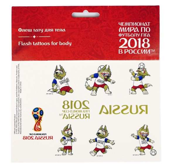 Временная тату в виде волка Забиваки, очаровательного талисмана Чемпионата мира по футболу 2018 - маст хэв этого лета! Для начала с картинки следует снять плёнку и приложить тату эскизом к коже. Далее картинку необходимо намочить с внешней стороны губкой, подождать 30 секунд и аккуратно снять бумажку. Временная тату готова! Картинку можно использовать не только для тела, но и для портативных устройств, телефонов и других аксессуаров. Изделие изготовлено из фольги, бумаги и клея. Рекомендованный возраст: 5 лет +