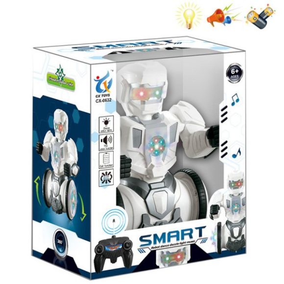 Радиоуправляемый робот со светозвуковыми эффектами. Управление игрушкой производится с помощью четырёхканального пульта. Возможные направления движения: вперёд, назад, направо и налево. Во время работы игрушка будет красиво светиться мерцающим светом, а при включении функции музыкального сопровождения - воспроизводить звуки и музыку. Робот работает от аккумулятора Ni - Cd AA 500 mAh 3,6 V (входит в комплект), пульт работает от 2-х батареек типа АА на 1,5 V (не входят в комплект). Зарядка аккумулятора осуществляется от сети (зарядное устройство входит в комплект). Размер робота (ДхШхВ) составляет 18х12х24 см. Изделие изготовлено из пластмассы с элементами металла. Рекомендованный возраст: 6 лет +