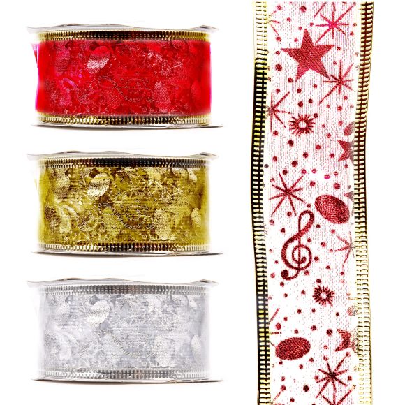 Декоративная лента может использоваться для оформления упаковки подарков, для декорирования новогодней елки и элементов интерьера. Лента представлена в ассортименте.